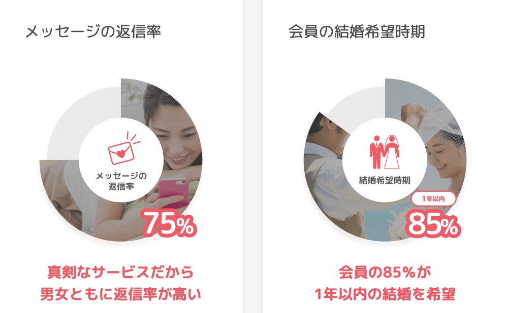 婚活に特化したマッチングアプリのなかでも特に会員数が多いので、都市部だけでなく地方でも出会いやすいでしょう。